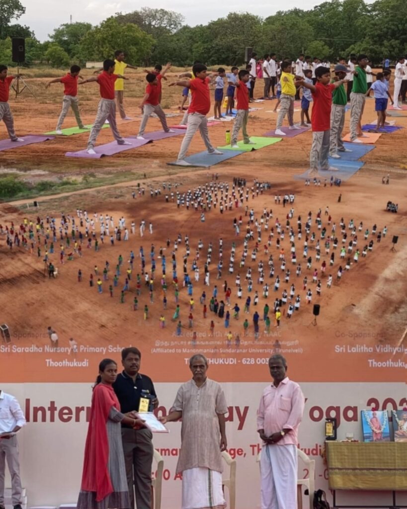 Many schools participated in this yoga day function. While performing the asanas he explained about the benefits of doing it side by side.